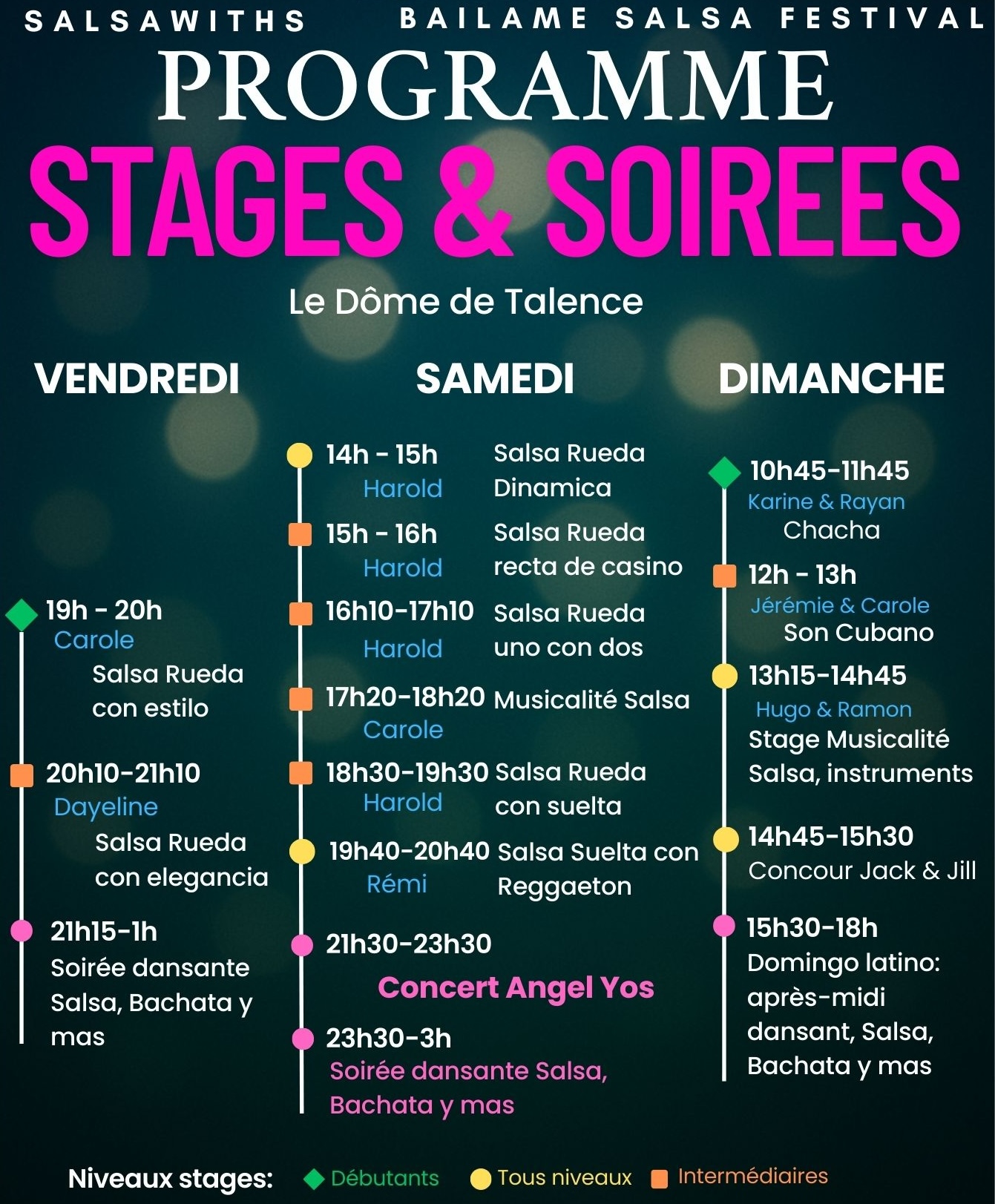 Avec des professeurs passionnés et dont les qualités de pédagogie ne sont plus à démontrer: Harold El Bantu, Rémi El rayo, Carole Salsawith’s, Dayeline Argota Alvarez, Jérémie Mencé, Karine et Rayan, ainsi que Hugo Motta et Ramon Olivero pour la partie musicalité.