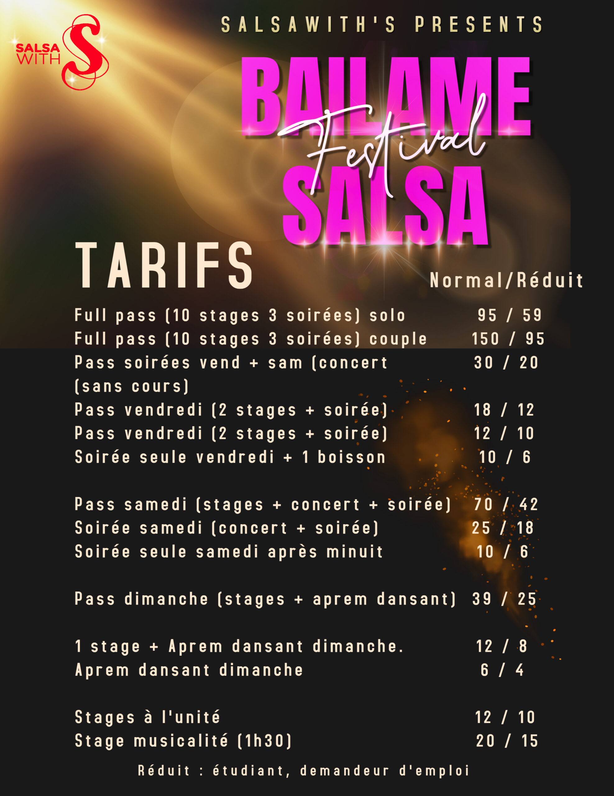 Pour infos, il y aura des billets à vendre sur place (dans la limite des places disponibles bien sur!) pour chacune des soirées ou après-midi dansant ou cours à l’unité. Sachez que le pass soirée vendu en pré-vente ne comprends aucun stage